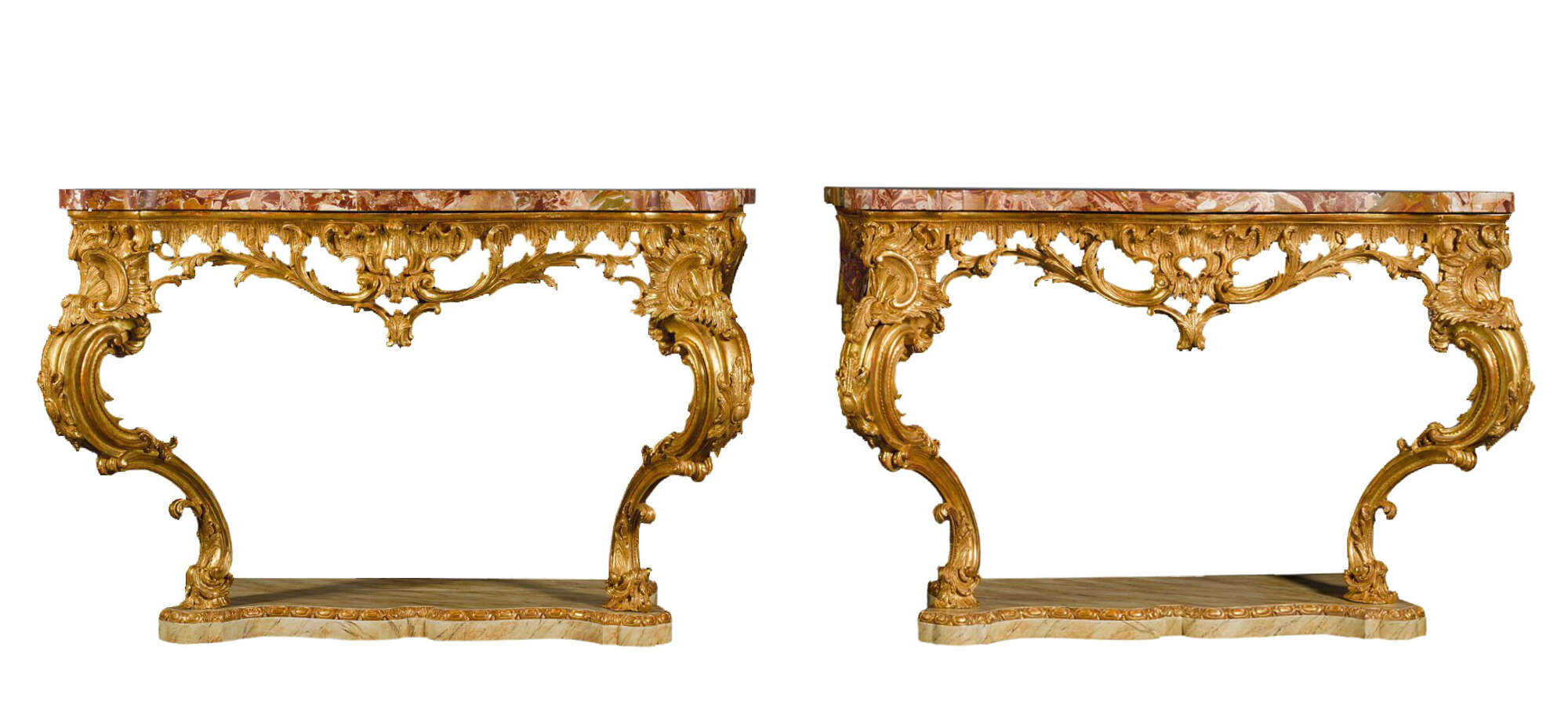 A pair of George III style carved giltwood console tables, each with the Sicilian jasper marble top on a faux marble base, 85cm high x 130cm wide