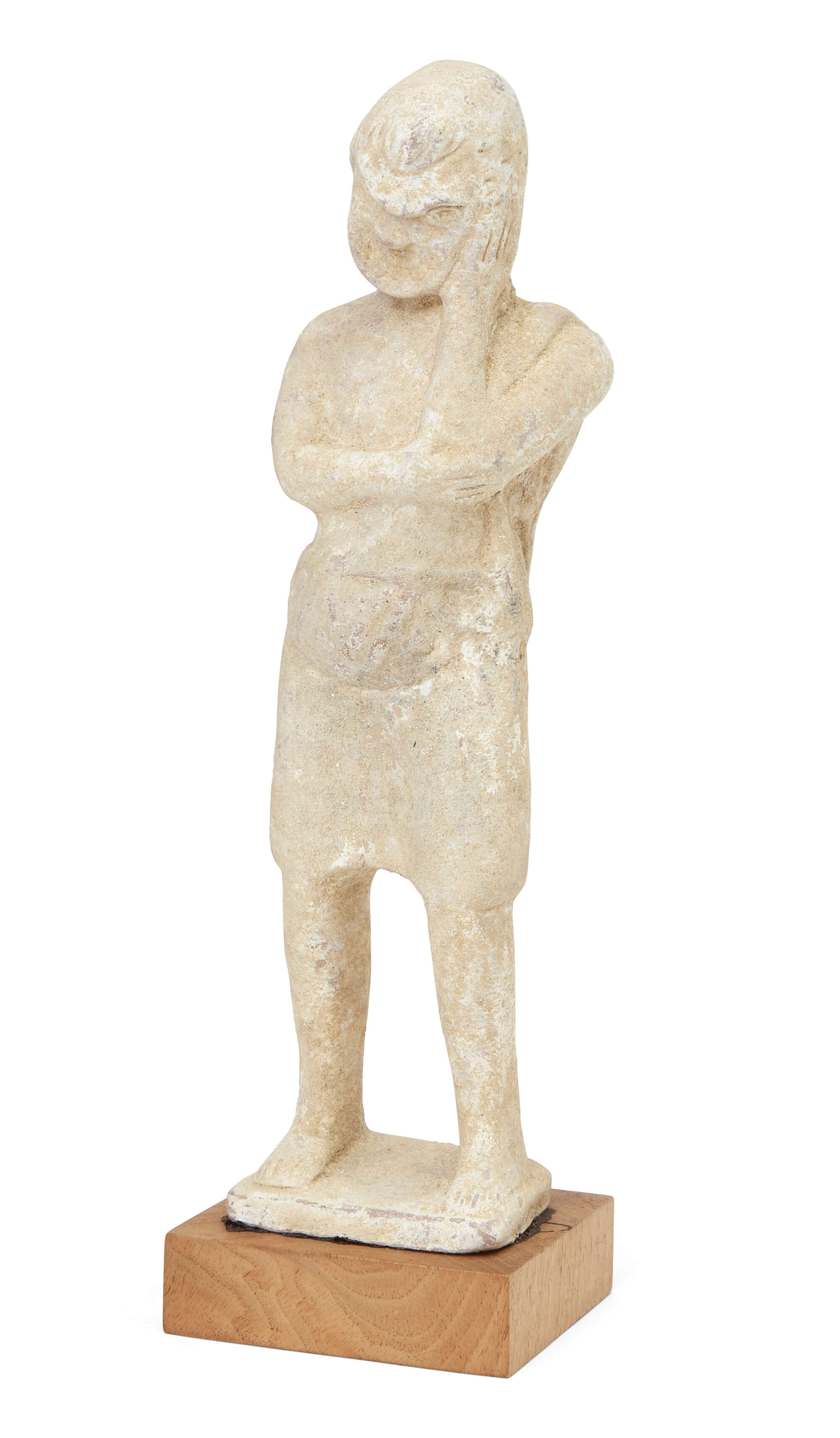 A hollow terracotta standing theatrical figure wearing the mask of a comic actor, resting his face against his left hand, with pot belly and knee-length tunic, on an integral base, Not Ancient, 25.3cm high