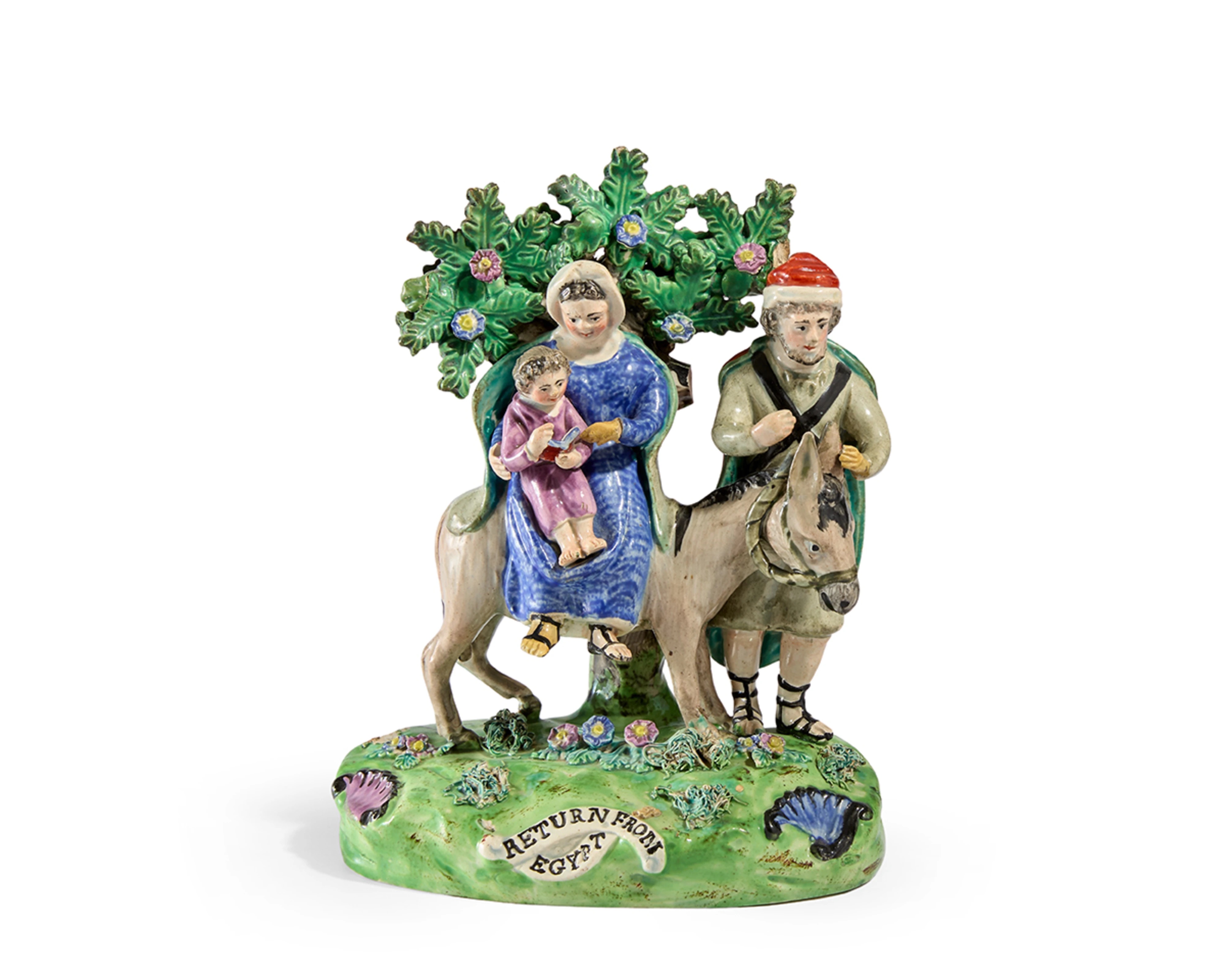 Though sometimes considered naïvely made or "rustic," bocage groups were costly to produce. The figures were crafted using multi-part moulds, with elaborately modelled bases and individually applied foliate sprays and flowerheads. In terms of subject matter, they often featured Classical or Biblical scenes — and sometimes exclusively so — in the bocage format. Perhaps the best-known makers of bocage groups are John Walton and Enoch Wood, with Walton’s pieces often bearing a banner impressed with his name.