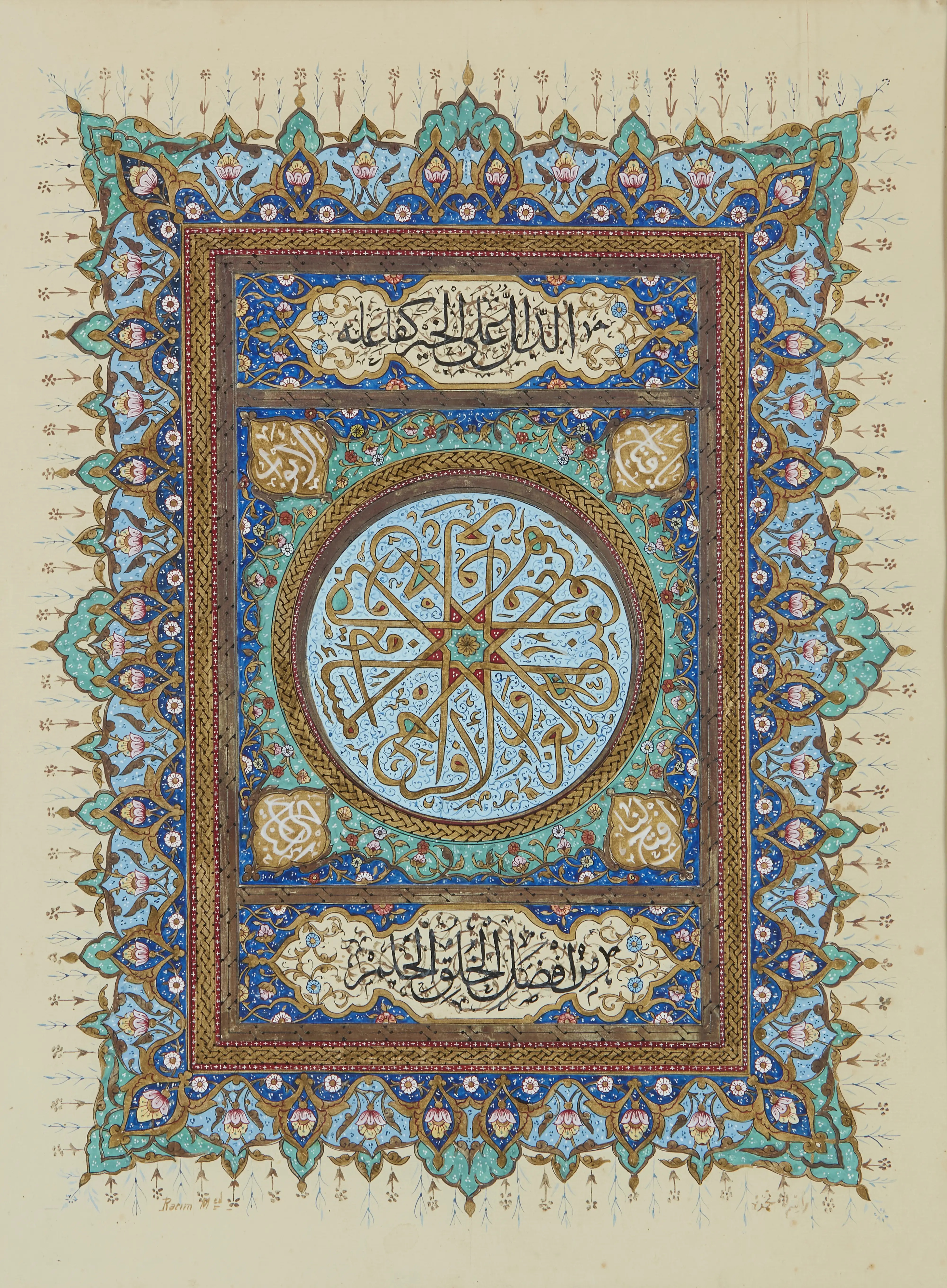 Mohammed Racim's calligraphic panel is another standout item from this sale. The Quranic invocation on a light blue background is the perfect focus point to the colourful, detailed borders all around it. The three vibrant shades of blue are perfectly framed and structured by the selective use of gold and red accents. I particularly loved noticing the artist's signature at the bottom of the piece - in Arabic on the right, and in European script on the left.