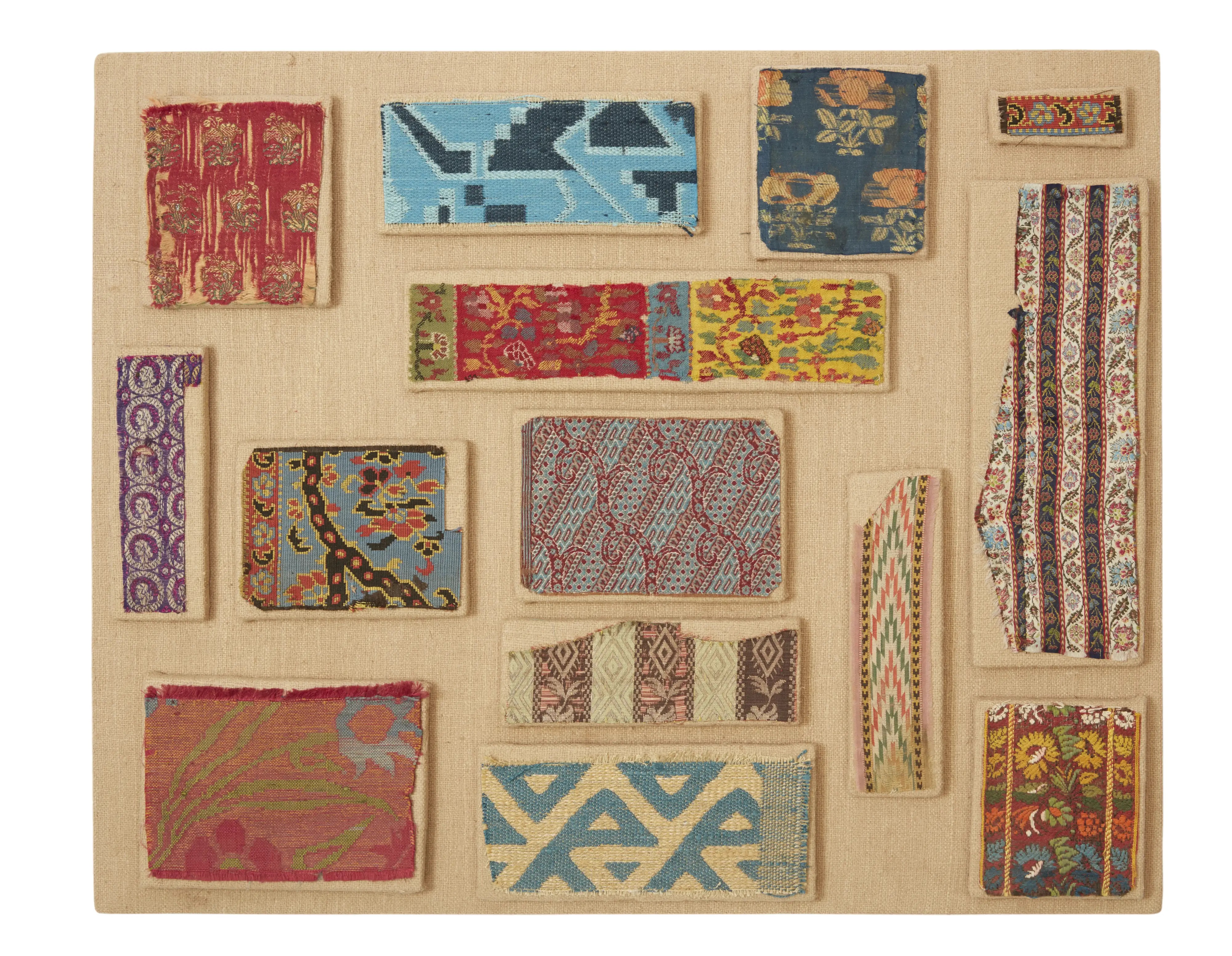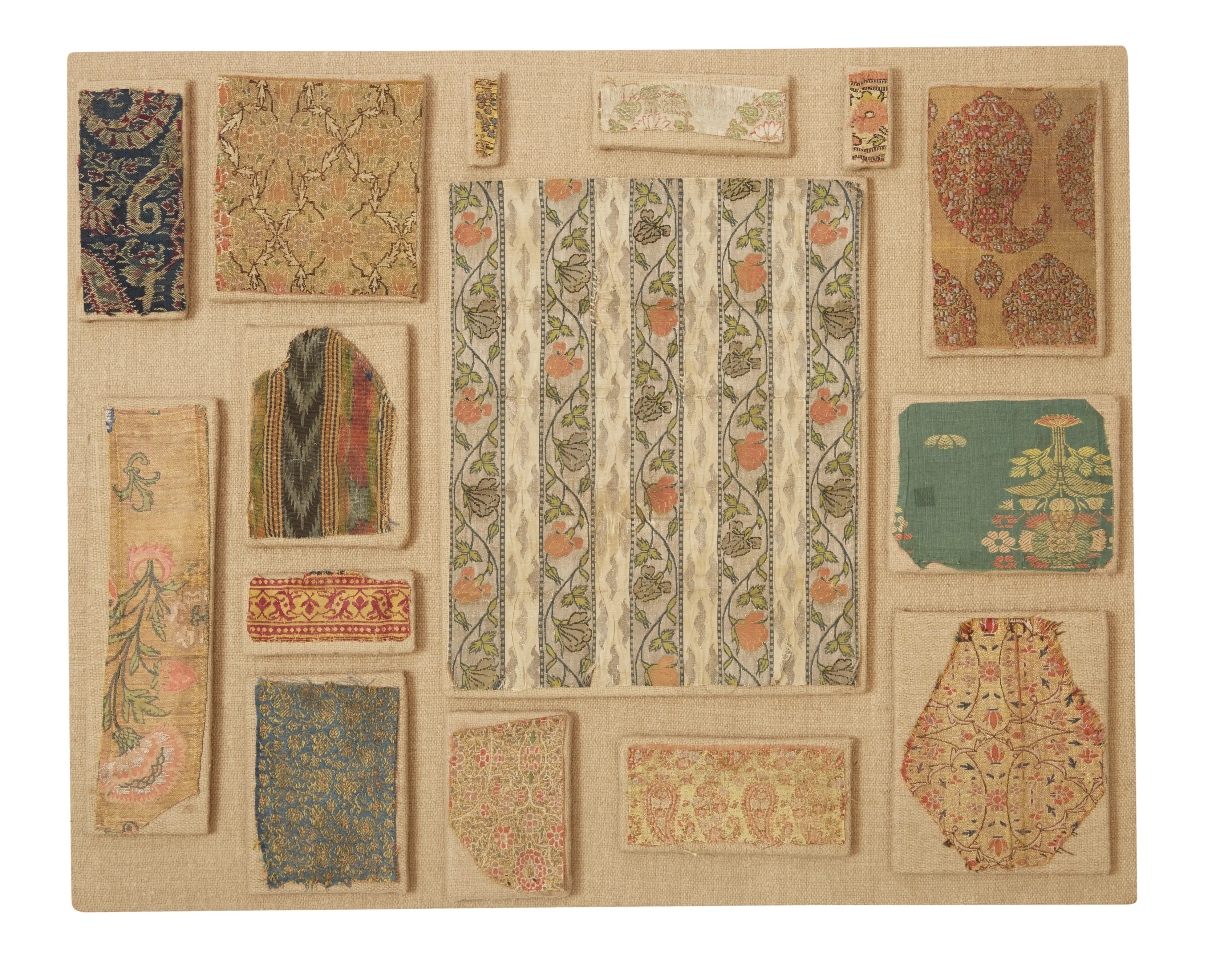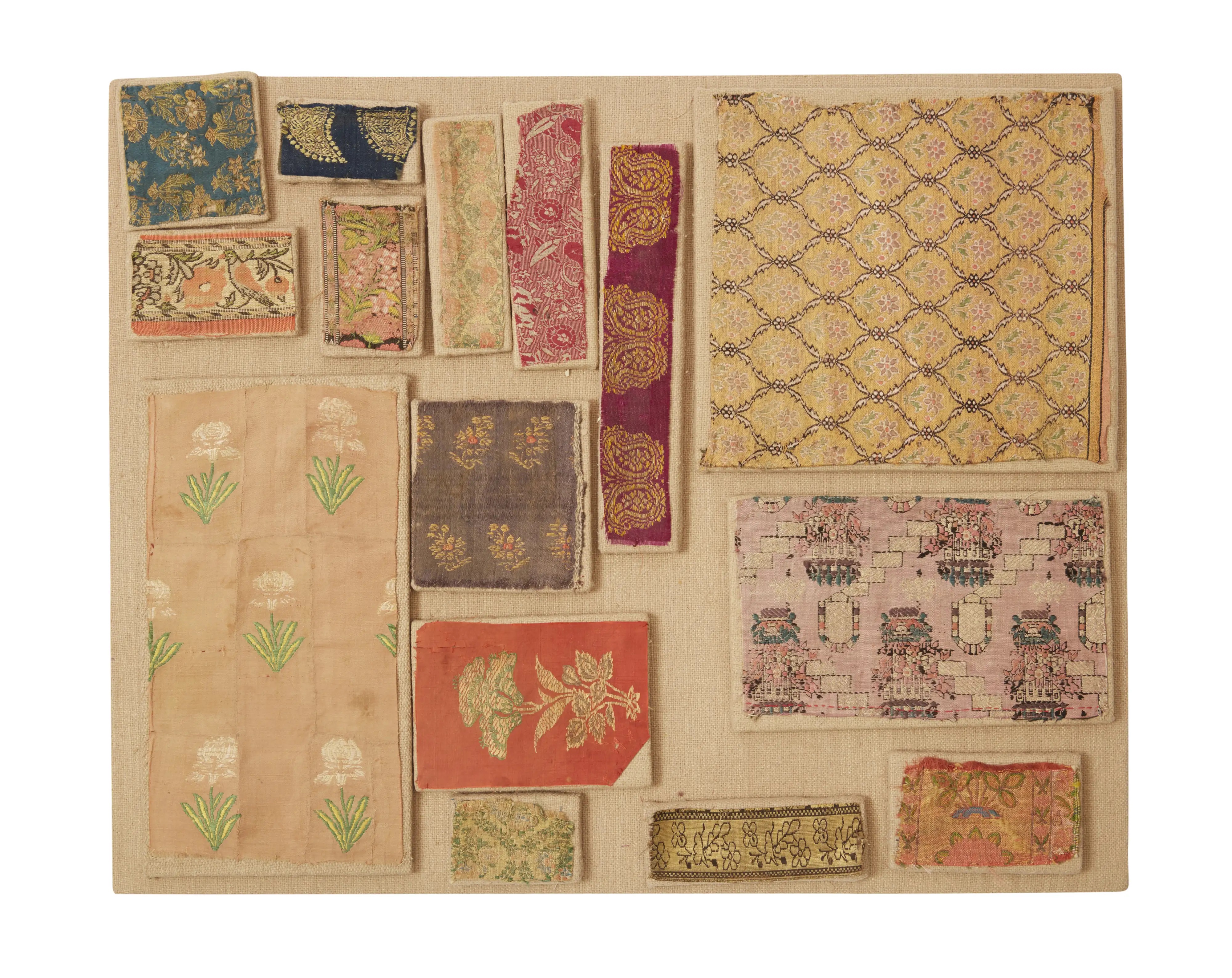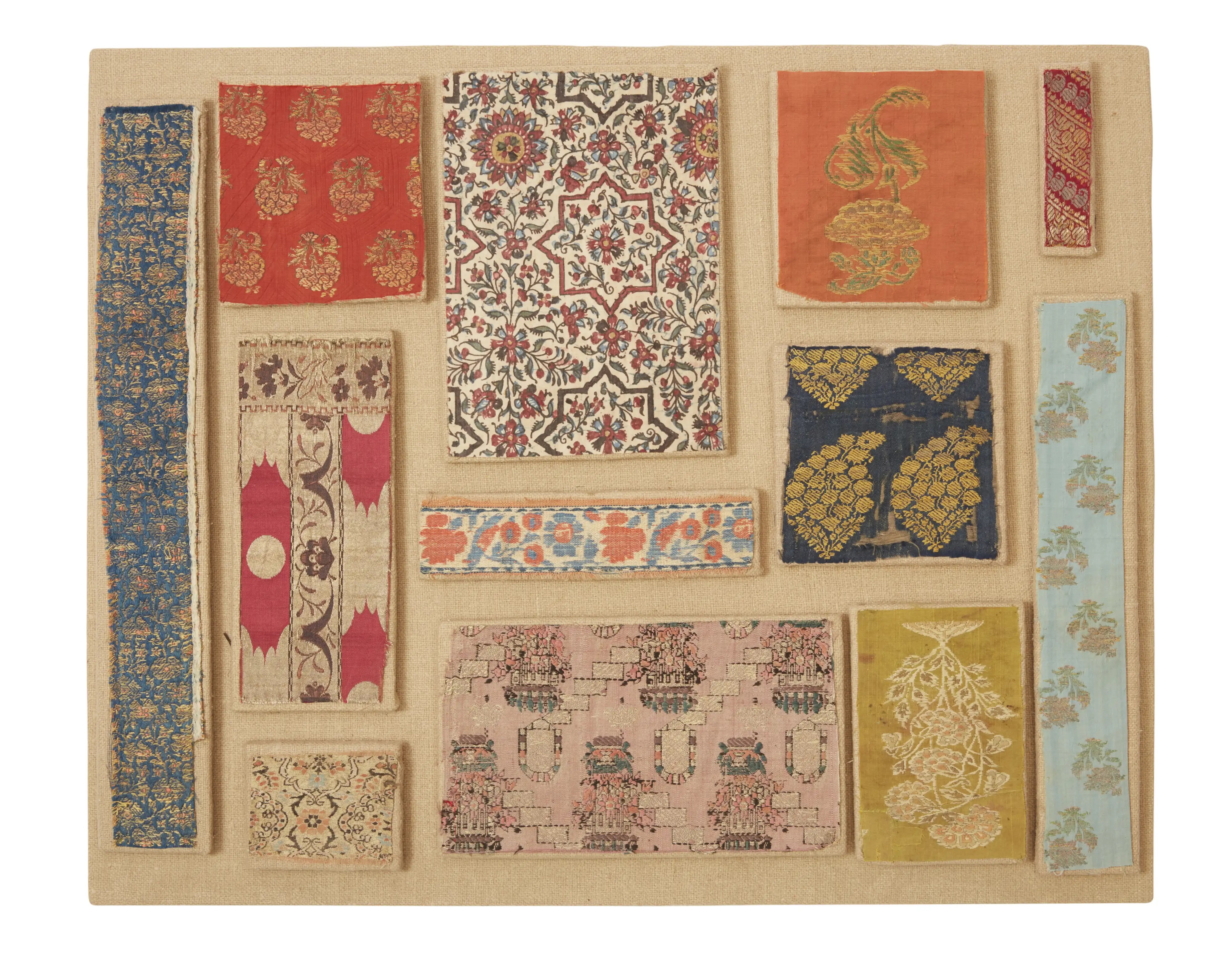 This wonderful study collection - already backed onto fabric to allow for close inspection together with minimisation of handling - showcases early 17th Century to 18th Century Persian textiles. In my mind this would be the perfect acquisition for a textile designer looking for their next source of inspiration. There are myriad colour combinations and patterns to study. They represent a range of uses too - some have silver or gold thread and would have been used for court attires, whilst others are more simple cotton borders that would have been used on soft furnishings.